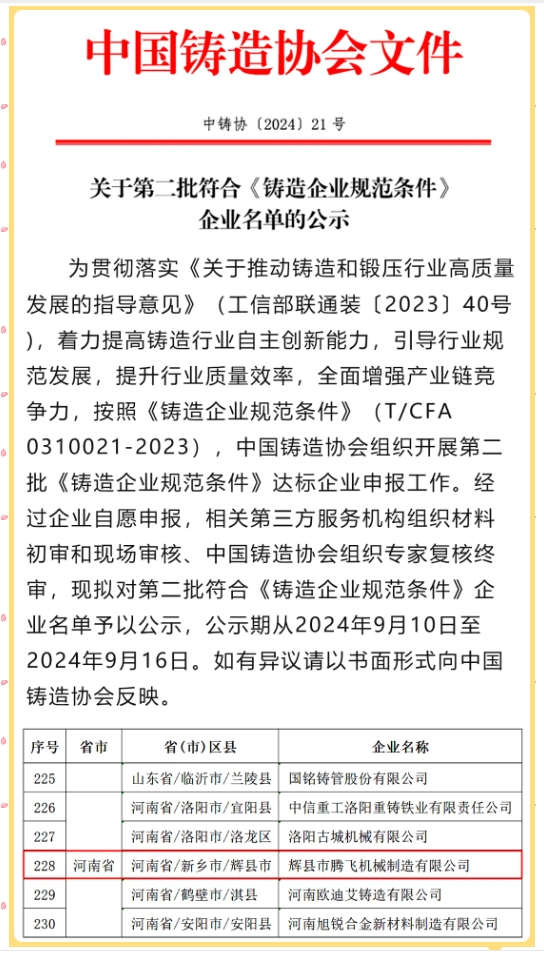 恭喜我司-輝縣市騰飛機(jī)械制造有限公司通過(guò)第二批《鑄造企業(yè)規(guī)范條件》達(dá)標(biāo)企業(yè)申報(bào)。